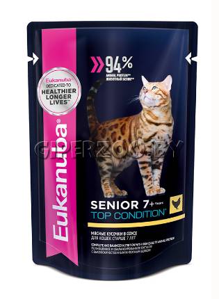 Ежедневное сочетание влажных и сухих рационов – залог здоровья вашей кошки. Это доказано клиническими исследованиями мирового лидера в области диетологии и ветеринарии Waltham™. Влажный рацион Eukanuba™ для кошек старше 7 лет в виде кусочков в соусе с содержанием курицы содержит высококачественный животный белок, необходимый для поддержания кошек на пике формы. Специально разработанная формула, содержащая антиоксиданты и жирные кислоты омега-3 и омега-6 в правильной пропорции, способствует поддержанию здоровья кожи и шерсти, а также сильного иммунитета питомца, что особенно важно после 7 лет.