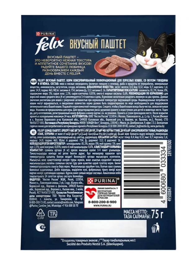 Обратите внимание на другие вкусы паштетов Felix: с лососем, курицей и индейкой."*