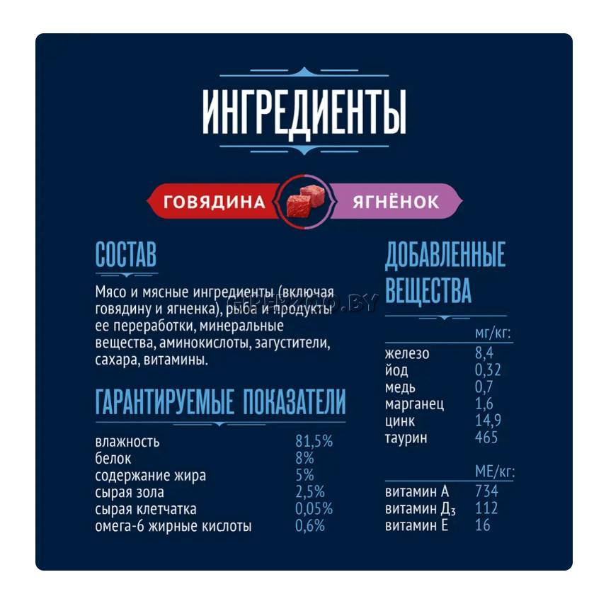 Состав: мясо и субпродукты (в том числе говядина 4%, ягнёнок 4%), растительные экстракты, минеральные вещества, витамины (включая таурин для здоровья сердца).