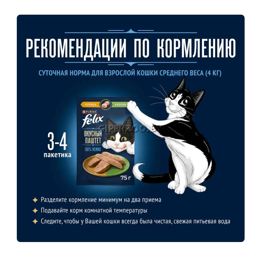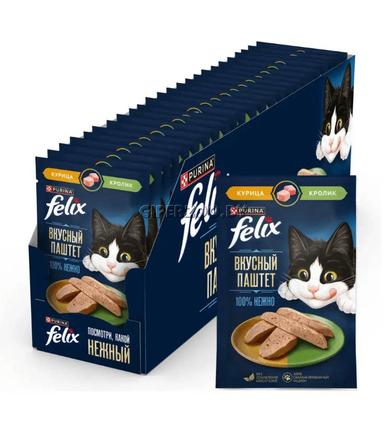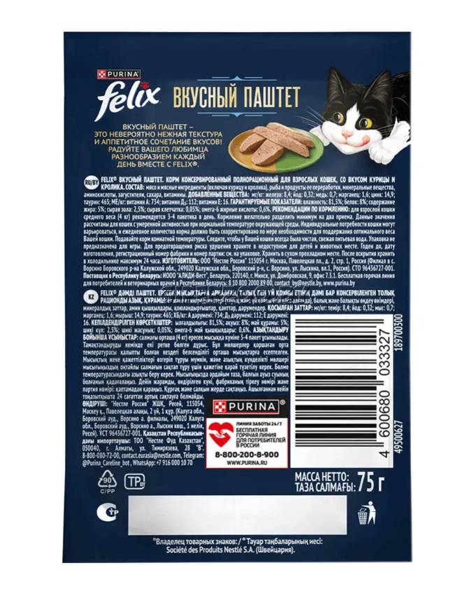 Ваша кошка заслуживает только лучшего, и паштет Felix с нежной курицей и диетическим кроликом — это идеальное сочетание вкуса и пользы! Этот аппетитный паштет станет любимым блюдом вашего питомца благодаря: