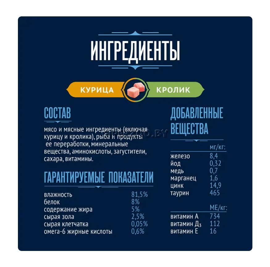 Состав: мясо и субпродукты (в том числе курица 4%, кролик 4%), растительные экстракты, минеральные вещества, витамины (включая таурин).