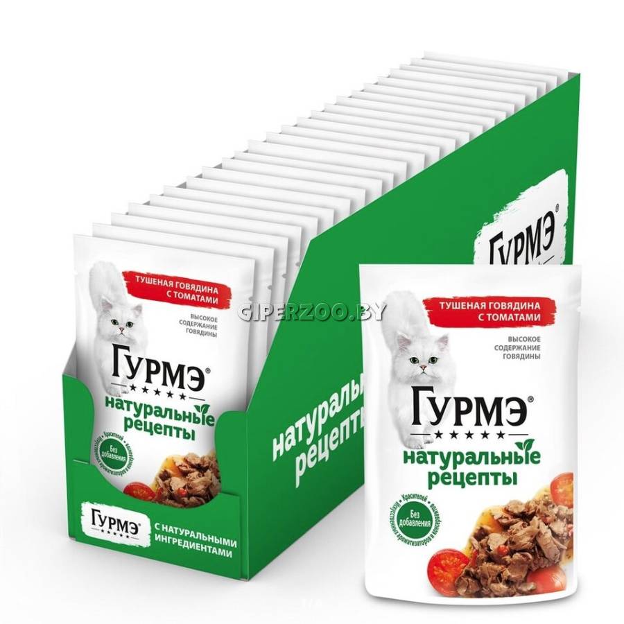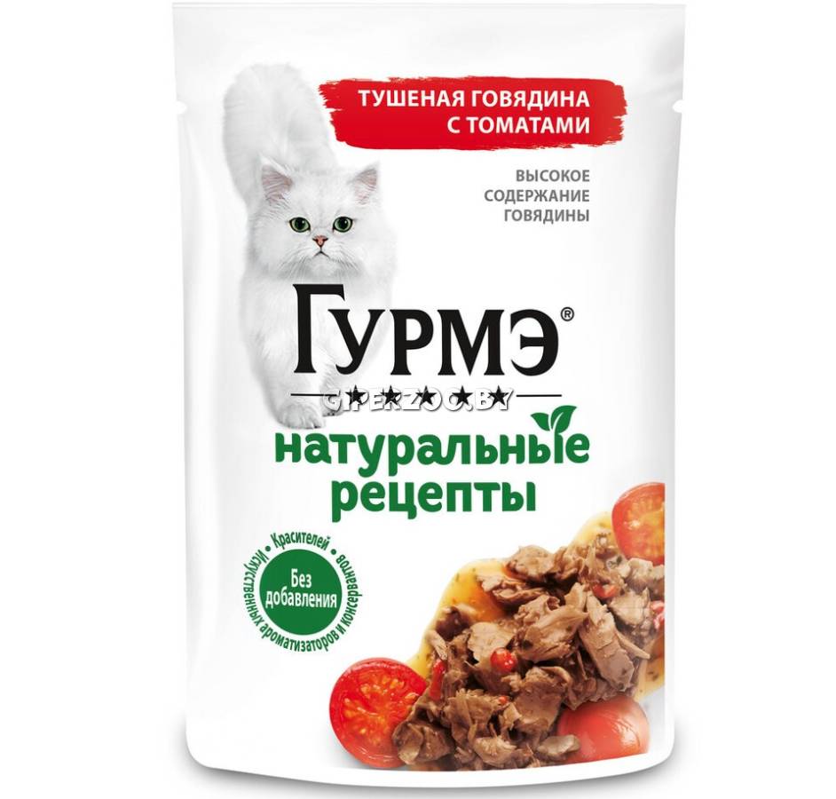 Gourmet Натуральные рецепты Тушеная говядина с томатами – влажный корм для взрослых кошек с говядиной.