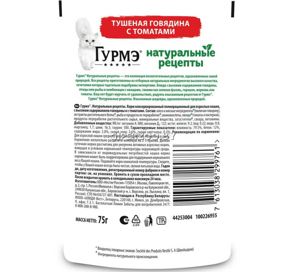 Корм для взрослых питомцев «Натуральные рецепты» — это блюда из отборных натуральных ингредиентов высокого качества. Сочетания приготовленных на пару мясных компонентов с овощами тщательно подобраны экспертами и оптимально дополняют друг друга по вкусу и пользе. Корм для кошек от Гурмэ® полнорационный, содержит все необходимые для здоровья микронутриенты. Влажный корм с богатой вкусовой палитрой не оставит равнодушным Вашего взыскательного гурмана.