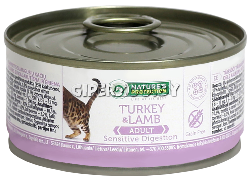 Консервированный кошачий корм Sensitive Digestion Turkey & Lamb – это мелко порезанные кусочки натуральной индюшатины и мяса ягнёнка, в нежном бульоне обогащённые минералами.