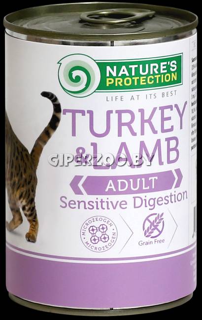 Nature's Protection Cat Sensible Digestion Turkey & Lamb - это влажный корм для взрослых кошек, представленный в виде мелко порезанных мясных кусочков в нежном бульоне. Подходит для питомцев с чувствительным пищеварением и аллергией на курятину, заботится о желудочно-кишечном тракте. Содержит мясо индейки - 35%, мясо ягненка - 35%, бульон, минералы.