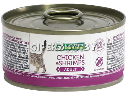 Консервированный корм для кошек Adult Chicken & Shrimps – это кусочки натурального мяса курицы и креветок, представленные в бульоне с дополненными минералами.