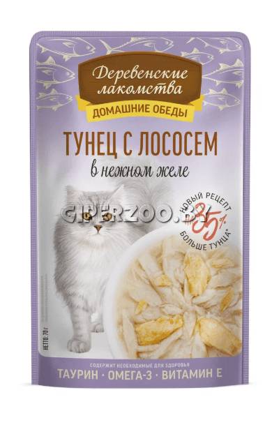 - Идеальная текстура: Сочные кусочки тунца и лосося бережно приготовлены в прозрачном нежном желе, которое очень нравится кошкам и помогает поддерживать водный баланс в организме.