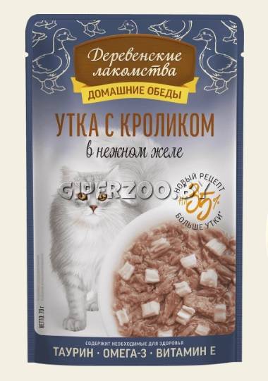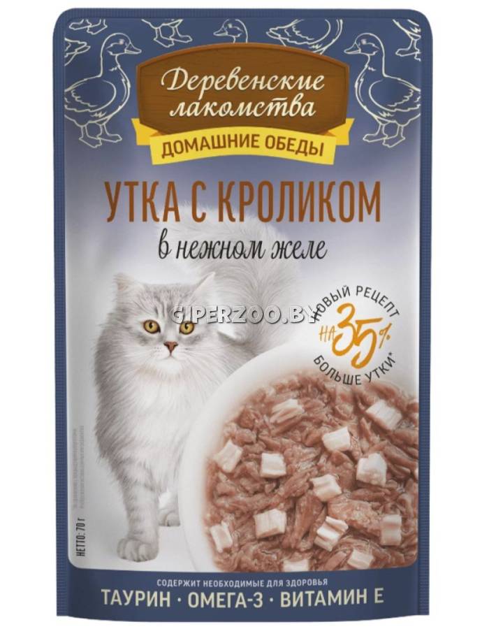 Консервированный влажный корм для кошек серии «Деревенские лакомства — Домашние обеды» — это изысканное угощение. В нем тщательно отобранные кусочки утиной грудки превосходно сочетаются с легкоусвояемым мясом кролика, формируя уникальную комбинацию, которая придется по вкусу всем, кто заботится о здоровом рационе. Легкая текстура желе облегчает процесс потребления, делая этот продукт идеальным даже для самых привередливых питомцев.