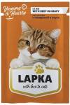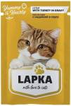 Влажный корм Lapka со вкусом индейки – это сытный обед для кошек. Если нужно быстро и недорого накормить кошку – «Лапка» отличный вариант.