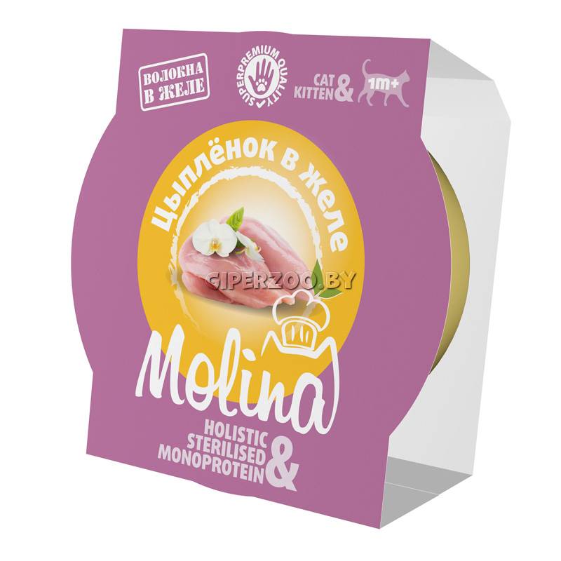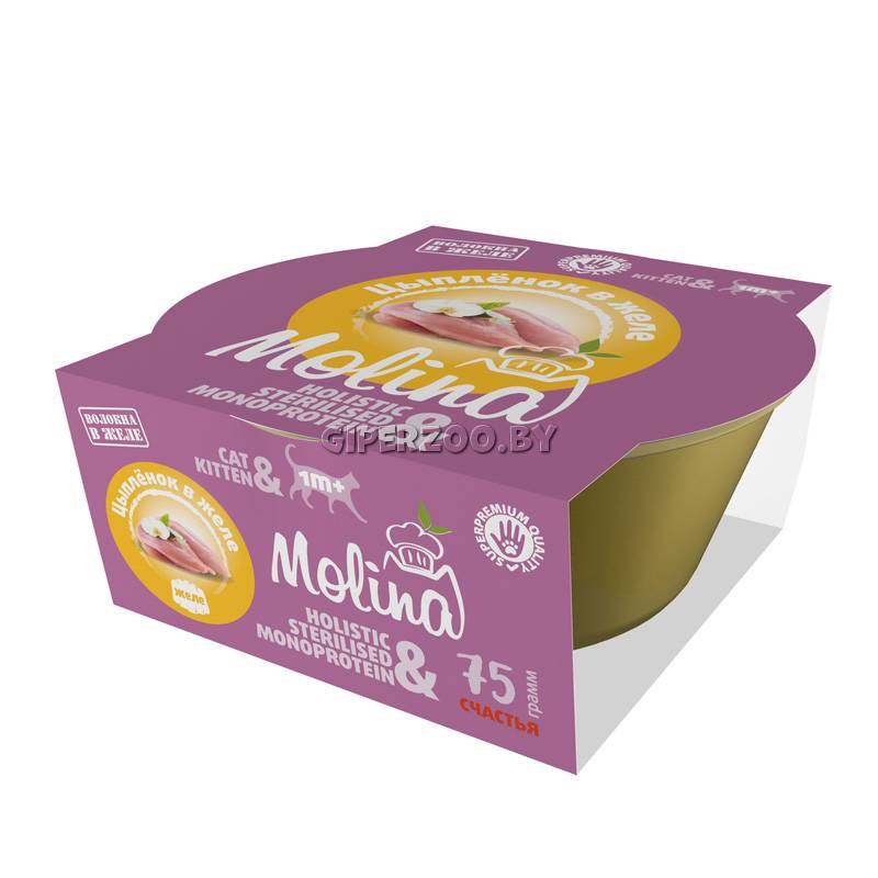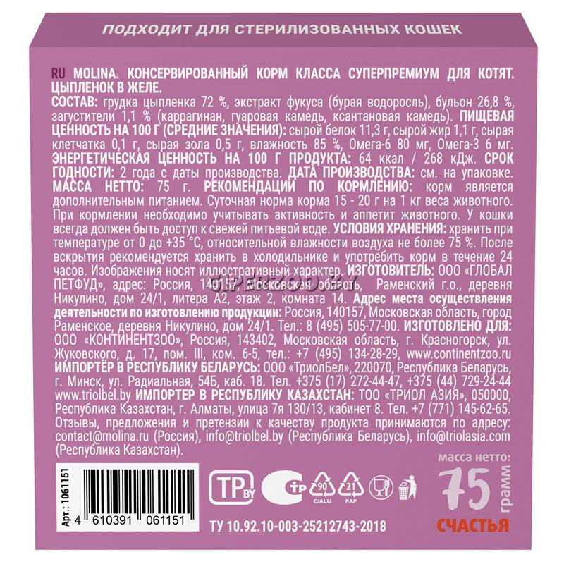 Molina Ламистер для котят (цыпленок в желе), 75 гр - сбалансированный корм для котят с натуральным мясом цыпленка в мягком желе. Благодаря порционному формату ламиcтера удобно хранить и подавать корм без потери свежести. Преимущества: оптимален для ежедневного кормления котят; поддерживает рост, развитие и пищеварение; фукус — источник йода и антиоксидантов; премиальный формат подачи.