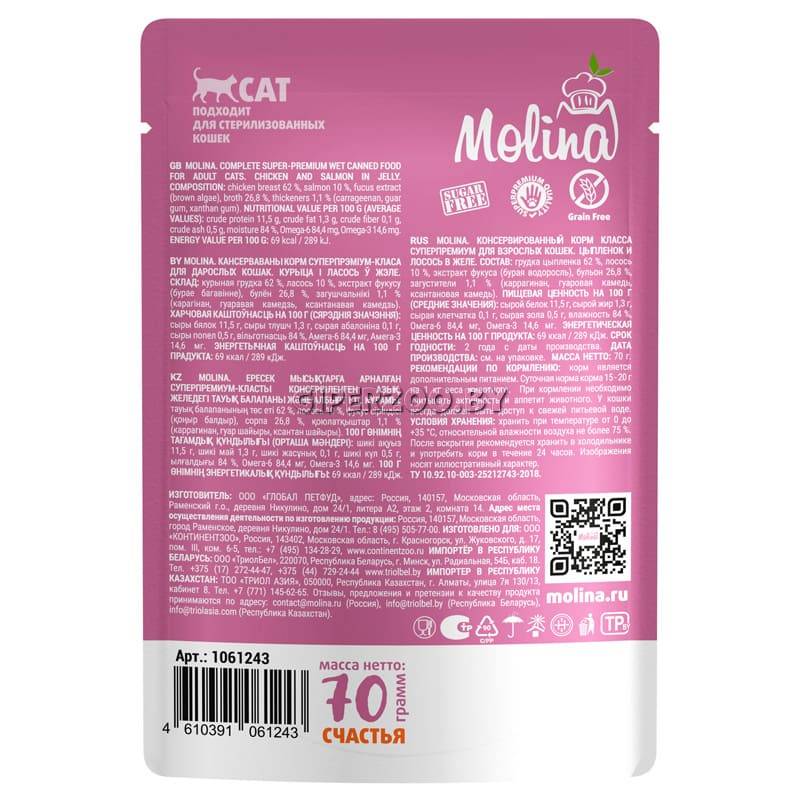 Molina Sensitive Adult Cat (цыпленок, лосось в желе), 70 г – это аппетитный и сбалансированный корм для взрослых кошек, созданный на основе нежного мяса цыплёнка и натуральных креветок в желе. Сочетание мяса и морепродуктов не только разнообразит рацион вашего питомца, но и насыщает его ценными белками и омега-3 жирными кислотами, поддерживая тонус и активность.