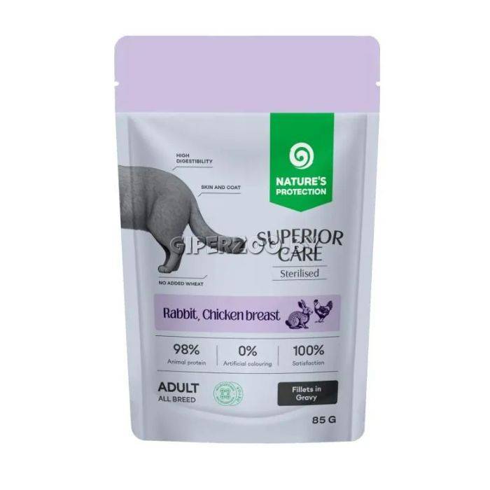 Nature's Protection SC Adult Sterilised (Кролик, куриная грудка, клюква в соусе) — влажный беззерновой корм для стерилизованных кошек.