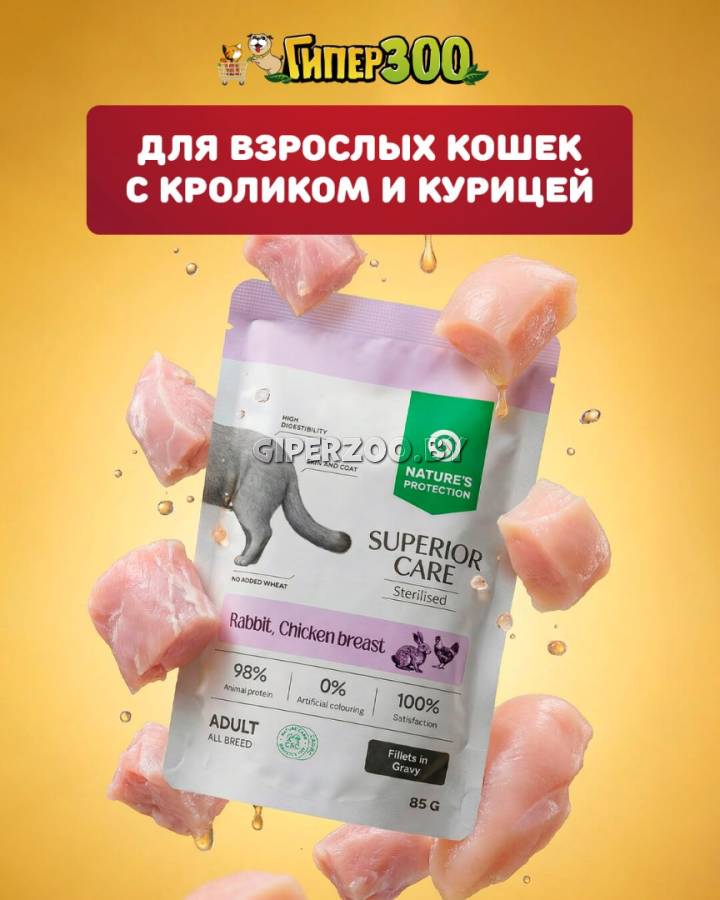 Nature's Protection SC Adult Sterilised (Кролик, куриная грудка, клюква в соусе) — влажный беззерновой корм для стерилизованных кошек.