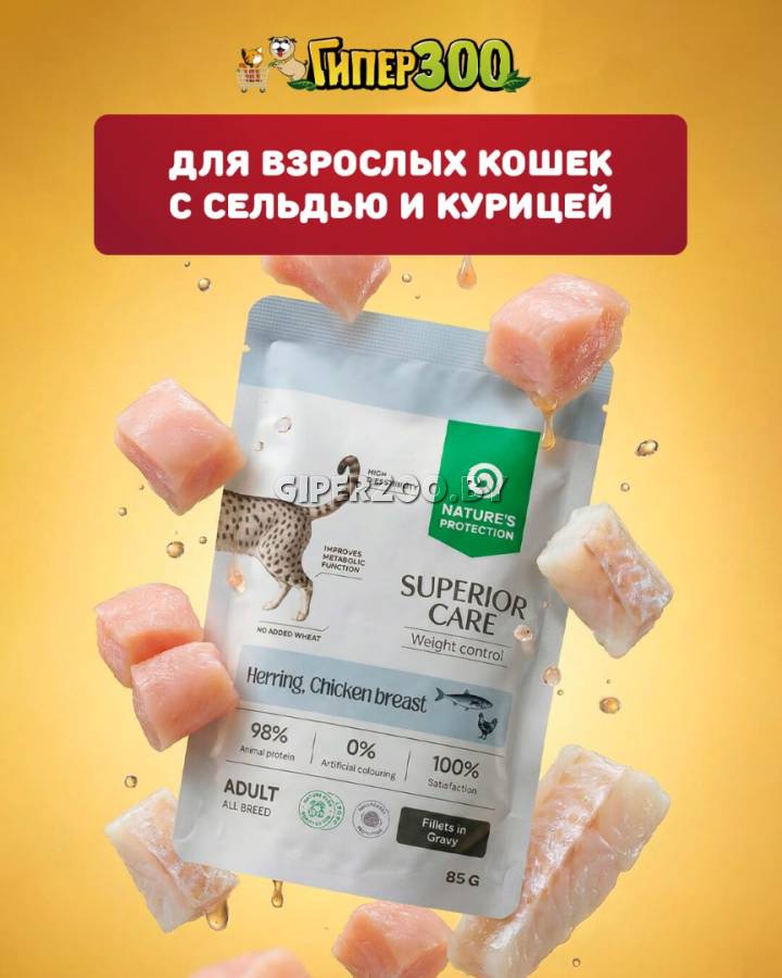 Nature's Protection SC Adult Weight Control (Сельдь, куриная грудка в соусе) — полноценный влажный корм создан для взрослых кошек всех пород, которым важно поддерживать оптимальный вес. Это забота о сбалансированном ежедневном рационе с учетом особых потребностей организма: формула с высоким содержанием животного белка, дополненная аминокислотами, витаминами и питательными веществами для поддержания иммунитета, здоровья пищеварения и природного баланса.