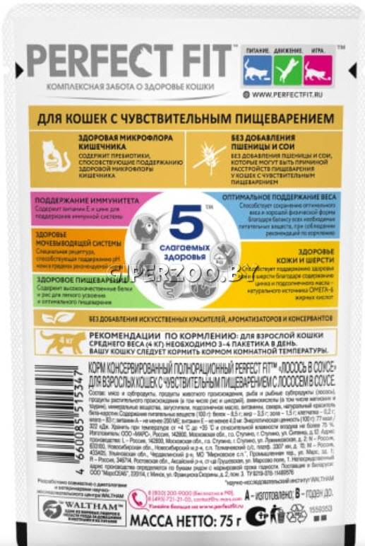 Для влажного корма PERFECT FIT Sensitive рагу с лососем для кошек с чувствительным пищеварением была разработана специальная рецептура, не содержащая пшеницу и сою, которые могут быть причиной расстройств пищеварения у кошек.