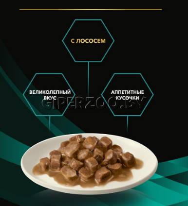 Ингредиенты: Мясо и мясные ингредиенты, рыба и продукты ее переработки (лосось 4%), яйца и продукты их переработки, злаки, продукты переработки растительного сырья (клетчатка гороха 1.4%), минеральные вещества, дрожжи, масла и жиры, аминокислоты, загустители, витамины, сахара. Высокоусвояемые ингредиенты: курица, индейка, печень, почки, яичный порошок, рисовая мука, рыбий жир.