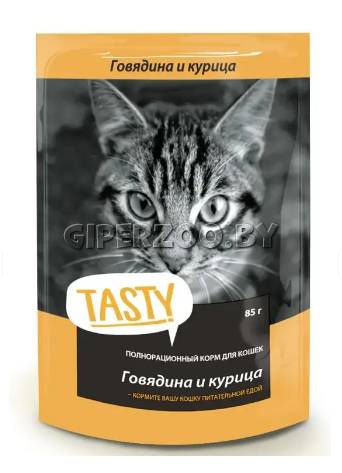 TASTY — это настоящее разнообразие вкусов специально для Вашей кошки. Побалуйте свою кошку линейкой влажных кормов TASTY, который обеспечивает полноценный рацион для кошек любых пород и возрастов. Мы разработали продукт по доступной цене, который, несомненно, понравится Вашей кошке, не снижая при этом уровень качества. Состав: Мясо и мясные субпродукты (в т.ч. говядина мин. 4 %), фарш куриный и куриные субпродукты, рыба и рыбные субпродукты, растительные компоненты, минеральные вещества и витамины. Содержит таурин. Не содержит ГМО.