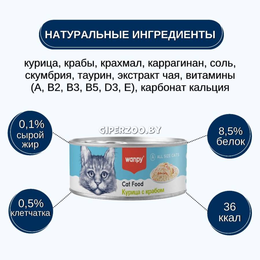 Wanpy Cat паштет (курица, краб), 95 гр – это высококачественный сбалансированный корм, который обеспечит вашего питомца необходимыми витаминами и минералами.