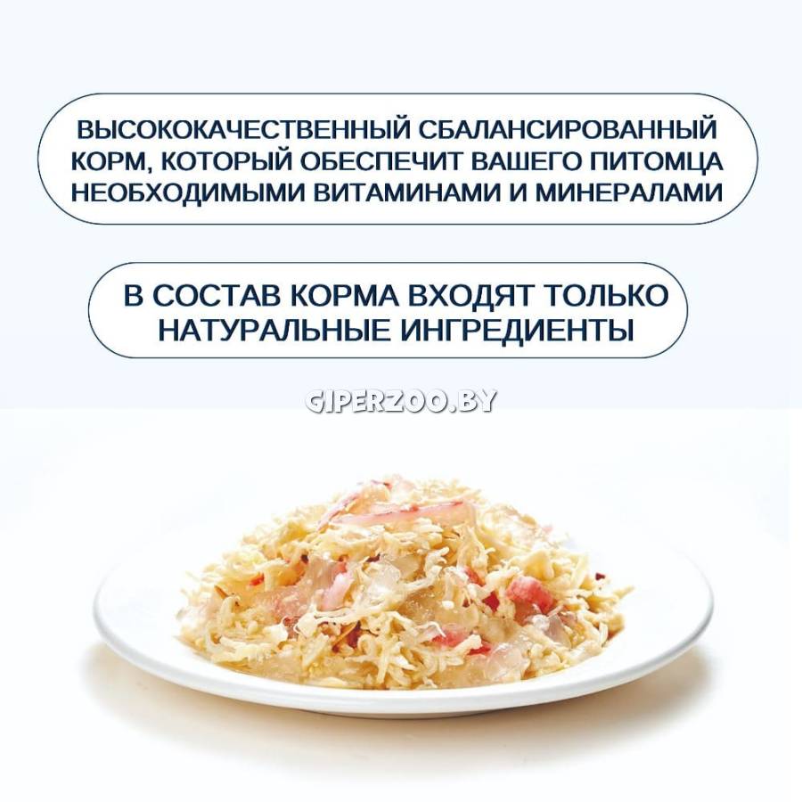 В состав корма входят только натуральные ингредиенты: курица и крабы, которые являются источником белка, необходимого для поддержания мышечной массы и здоровья кожи и шерсти. В составе также присутствует скумбрия, богатая омега-3 жирными кислотами, которые положительно влияют на работу сердца и сосудов.