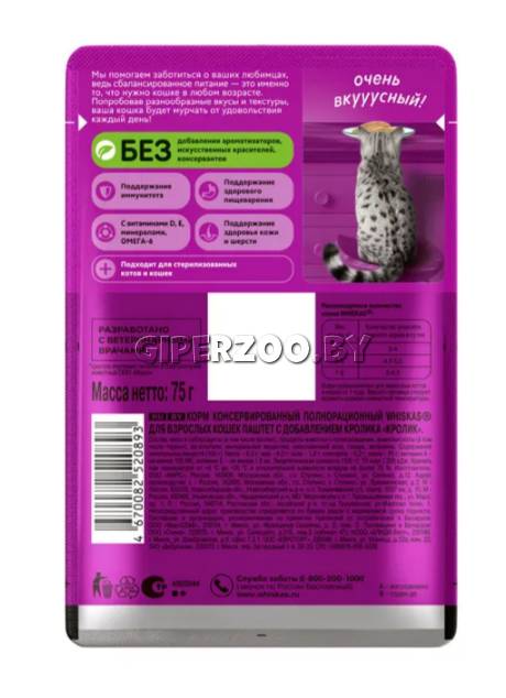 Whiskas с кроликом (паштет), 75 гр - это сбалансированный рацион, приготовленный именно так, как любит ваша кошка. Аппетитный паштет с кроликом подарит вашей любимице настоящее удовольствие. Рацион Whiskas содержит все необходимое, чтобы еда вашей кошки была не только вкусной, но и полезной. Whiskas поддержит иммунитет, позаботится о здоровом пищеварении и здоровье кожи и шерсти вашей кошки. Подходит для стерилизованных котов и кошек.