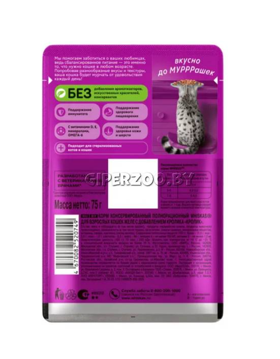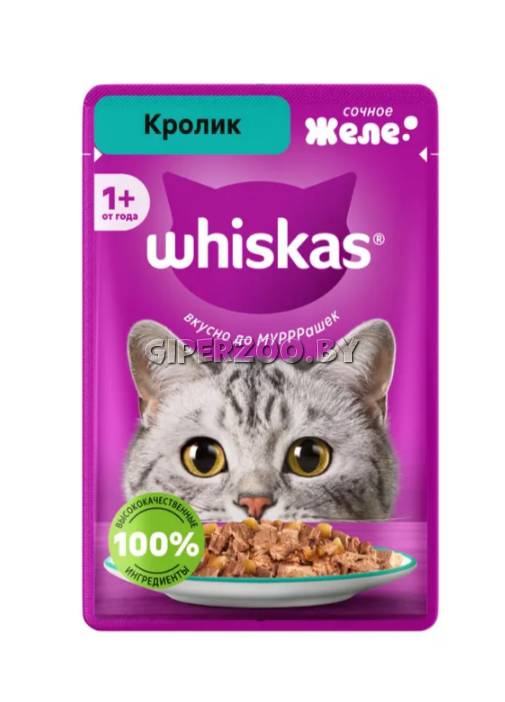 Whiskas с кроликом (желе), 75 гр - это сбалансированный рацион, приготовленный именно так, как любит ваша кошка. Отборные мясные кусочки с кроликом в аппетитном желе придутся по вкусу вашей любимице.Рацион Whiskas содержит все необходимое, чтобы еда вашей кошки была не только вкусной, но и полезной. Whiskas поддержит иммунитет, позаботится о здоровом пищеварении и здоровье кожи и шерсти вашей кошки. Подходит для стерилизованных котов и кошек.