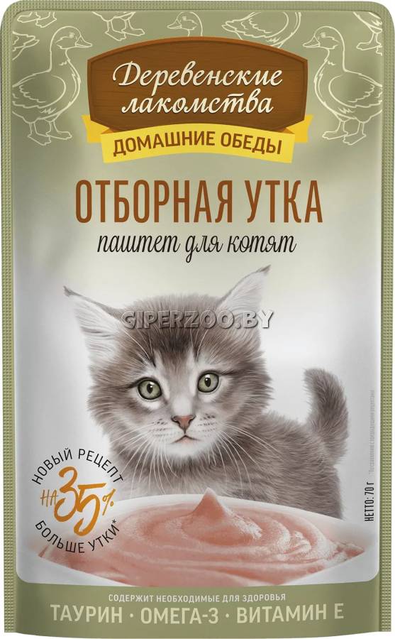 Консервированный влажный корм для котят серии «Деревенские лакомства — Домашние обеды» в виде паштета из отборного утиного филе приготовлен специально для малышей по уникальной рецептуре и имеет нежную текстуру. Это вкусное угощение содержит витамин Е, Омега-3 и таурин. Идеально подходит для лакомства, дополнения к основному рациону или самостоятельного приема пищи.