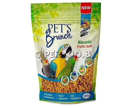 Pet's Brunch Функциональный десерт Biscotti Fruits Soft, 230 гр - это специально разработанная функциональная добавка к основному рациону питания в период активного роста, линьки, сезона размножения, а также для укрепления здоровья ослабленных птиц.