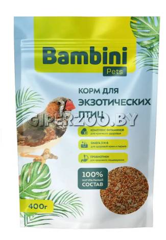 Bambini Pets Корм для экзотических птиц — сбалансированный повседневный корм для экзотических птиц создан с заботой о ваших амадинах, амарантах, астрильдах и других ткачиковых. Наши специалисты подобрали ингредиенты с учетом питания экзотических птиц в дикой природе. В состав рациона входит комплекс витаминов для крепкого здоровья, омега-3 и 6 для здоровой кожи и перьев, пробиотики для здорового пищеварения. Корм Bambini Pets не только вкусный, но и полезный.
