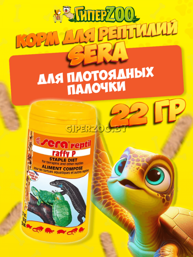SERA Корм палочки для водных черепах "Raffy P" (Сера Раффи Р), 18 гр – сбалансированный основной корм для водных черепах. Состоит из плавающих гранул, произведенных путем бережной обработки сырья; предназначен для плотоядных рептилий, таких как водяные черепахи.
