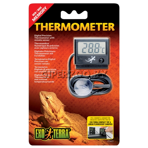 Цифровой термометр Exo Terra оснащен выносным датчиком для точного измерения и долговечности. Этот точный прибор поставляется с программируемыми минимальными и максимальными настройками памяти, которыми можно управлять с помощью одной кнопки. Датчик удерживается на месте с помощью присоски, в то время как инструмент можно закрепить с помощью застежки-липучки (входит в комплект) или он просто задвигается на место на Exo Compact Top или Linear Fluorescent Top .