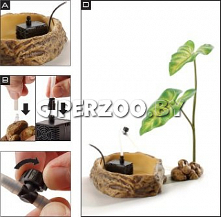 разместите насос на дне водоема или поилки (например EXO-TERRA Water Dish), соедините насос и растение при помощи трубки, отрегулируйте частоту образования капель поворотом клапана, установите растение немного выше водоема, чтобы предотвратить пролив воды.