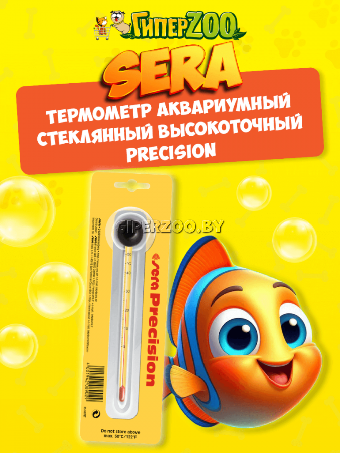 Sera Precision thermometer это современный высокоточный стеклянный термометр для аквариума. Тонкая капиллярная трубка позволяет легко считывать показания. С помощью термометра вы всегда будите знать точную температуру воды в аквариуме. Благодаря высококачественной и долговечной присоске термометр можно зафиксировать в любом удобном для обозрения месте. Термометр должен быть установлен на внутренней стороне стекла аквариума в месте хорошего тока воды. Высокоточный термометр не содержит ртути безопасен для рыб и других обитателей аквариума. Элегантный, изящный дизайн Определение температуры с высоким разрешением в диапазоне 0-50 ° С Долговечная резиновая присоска Размеры: Ø 6 мм, длина 150 мм