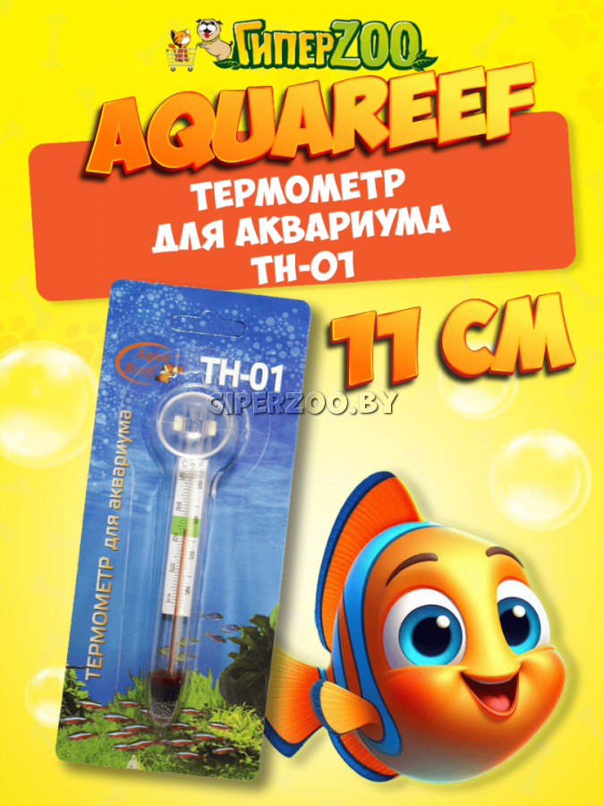 Термометр "Aqua Reef" предназначен для измерения температуры воды в аквариуме. Корпус изделия выполнен из высококачественного стекла. В качестве индикатора температуры используется спирт с примесью красного красящего вещества. Термометр крепится к стенке аквариума на ровную поверхность при помощи присоски и должен быть погружён в воду по крайней мере на половину своей длины.