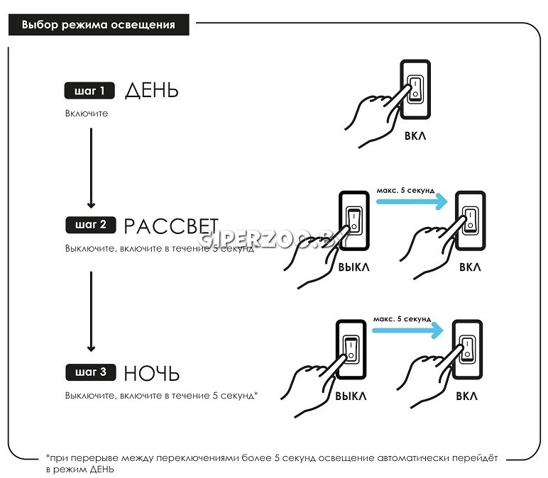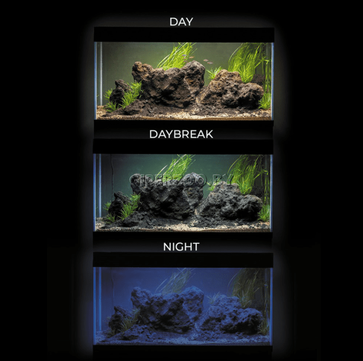 Три режима освещения: DAY / DAYBREAK / NIGHT. Низкое энергопотребление и современная светодиодная технология. Возможность добавления освещения до 9 модулей Leddy Tube. Возможность изменения положения освещения.