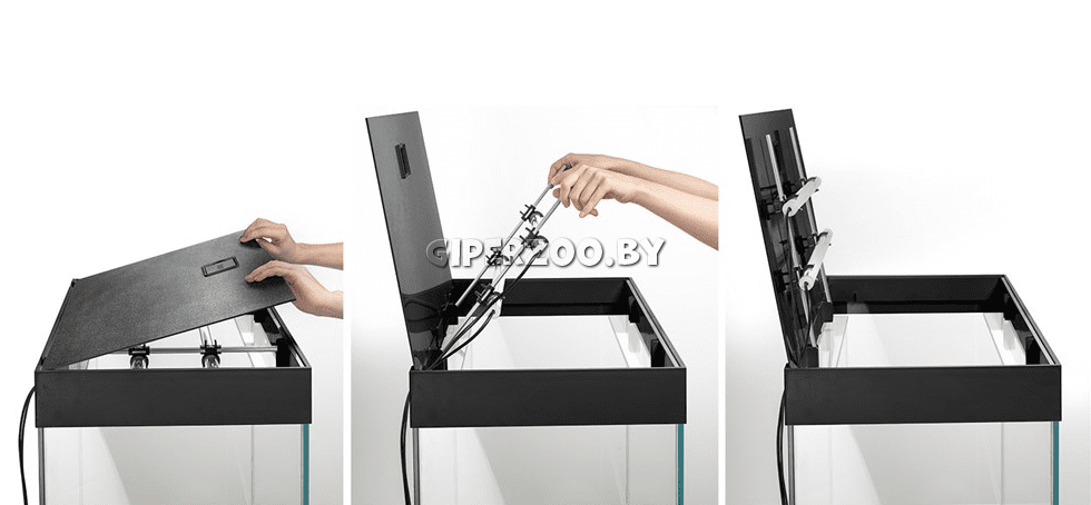 Свободный и удобный доступ внутрь аквариума с системой System Smart Open в крышке. Отсутствие поперечных усиливающих элементов. Отверстия в задней части крышки для монтажа шлангов / кабелей. Модная сатиновая отделка крышки и нижней рамки. Удобно кормить рыбок.