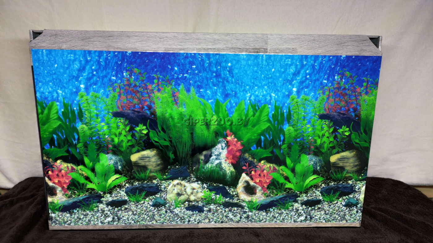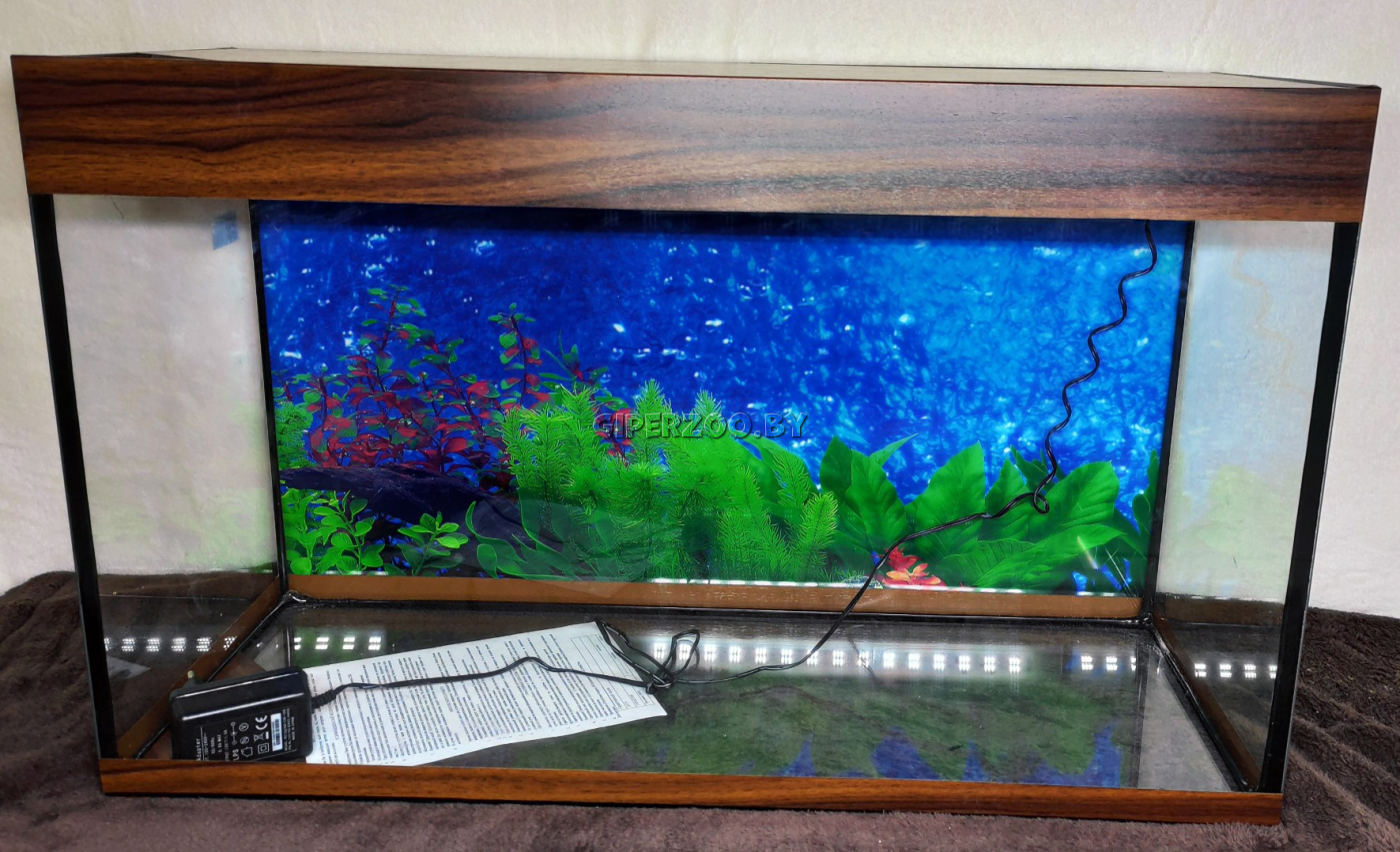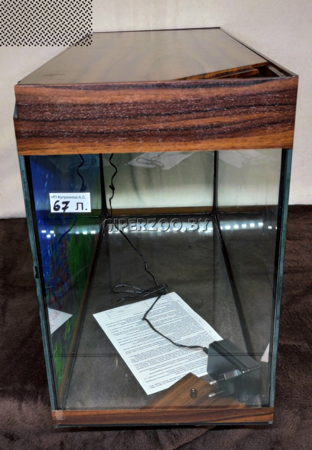 AQUA 67 л - аквариум прямоугольный с крышкой и подсветкой. В задней части аквариума предусмотрены выходы для проводов света, обогревателя и фильтра. В крышке есть дверца для удобства кормления рыб. Имеет декоративную отделку. Возможны различные варианты цвета (белый, темный орех).