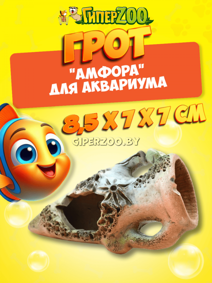 Грот "Амфора" сделан из глины, ручная работа. Станет прекрасным дополнением интерьера подводного мира, а также местом отдыха и нереста рыбок. Размеры: 8,5*7*7 см