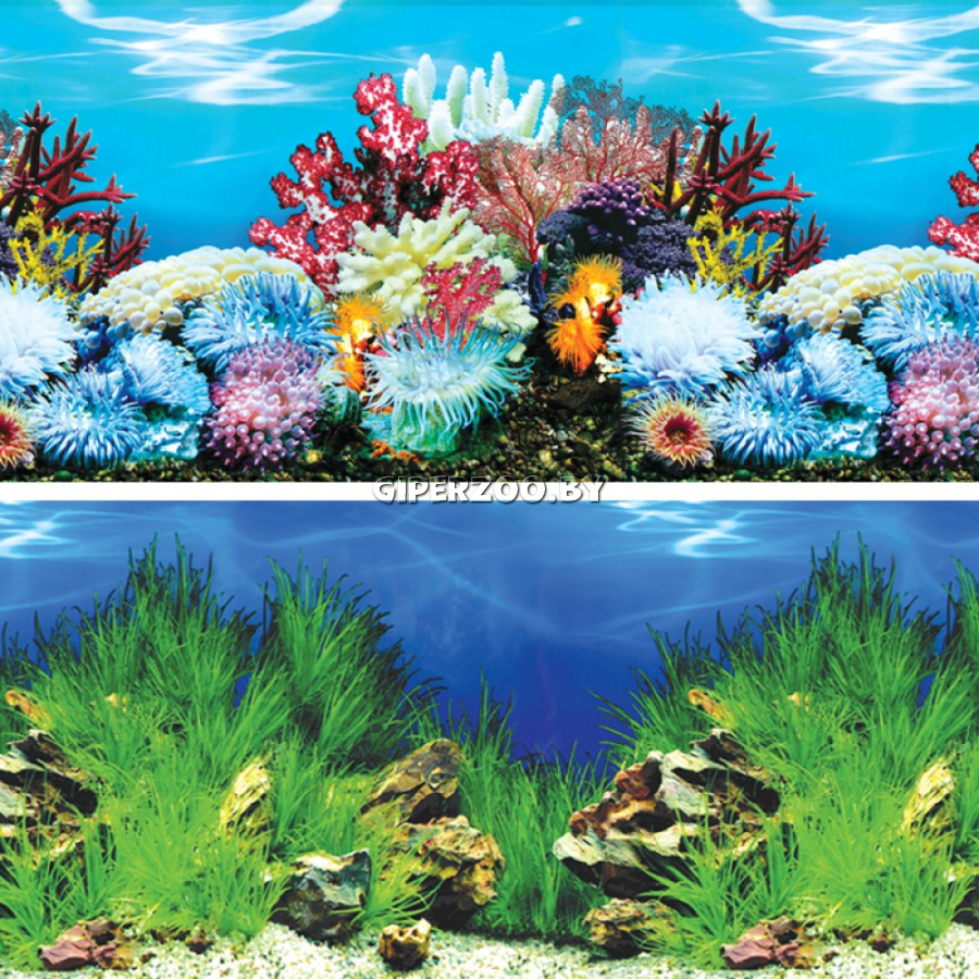 Laguna Фон 8006/9022 "У берегов Австралии/Холмистая долина" - это двусторонний аквариумный фон на ламинированной бумаге с красочными фотографиями подводного мира.