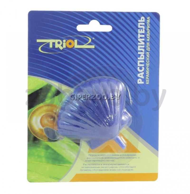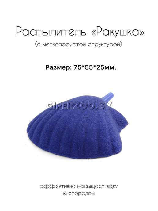 Декоративный распылитель в виде морской раковины изготовлен из песка, смешанного с полиэфирной смолой, что обеспечивает распылителю мелкопористую структуру. При этом воздух, проходя через распылитель, дробится на большое количество воздушных пузырьков, которые активно насыщают кислородом аквариумную воду.