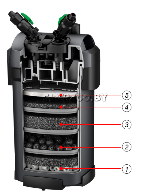 Tetra EX 1200 Plus обеспечивает эффективную очистку воды в любом типе аквариума объемом не меньше 200 литров. Загрязненная вода в аквариуме очищается благодаря 5 различным видам фильтрующих элементов. Вода проходит через био-шарики, керамические кольца, стандартную фильтрующую губку, угольный наполнитель и мелкопористую губку. Фильтрующие элементы удаляют различные частицы грязи и обеспечивают механическую биологическую и химическую фильтрацию аквариумной воды.