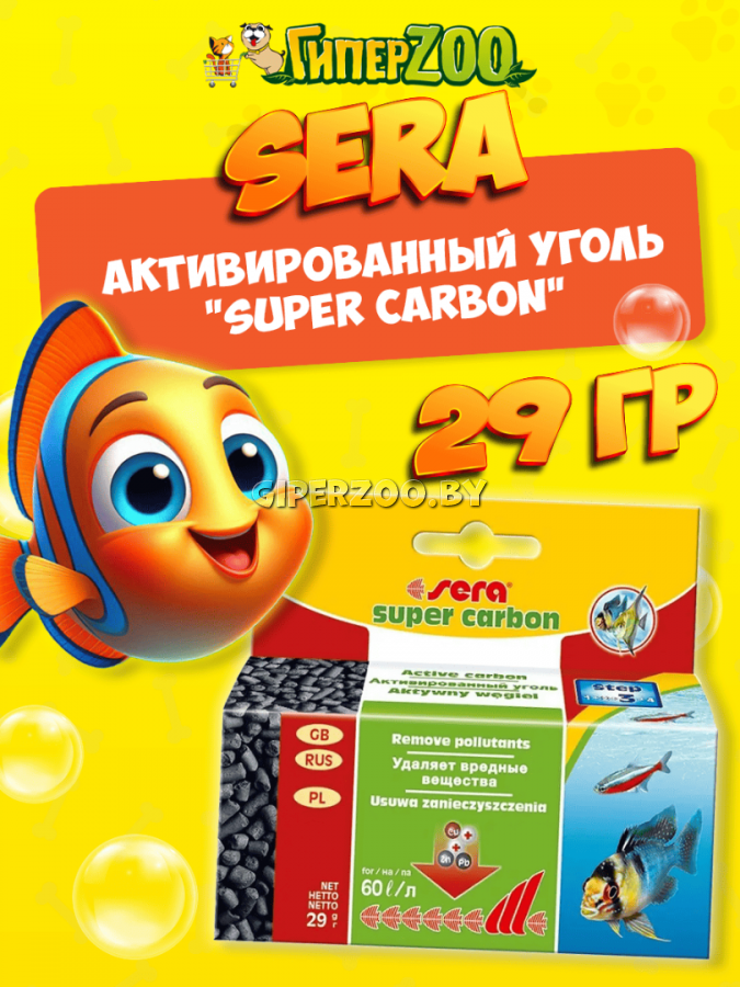 Специальный активированный уголь с высокой абсорбирующей активностью sera"Super Carbon" быстро, эффективно, без побочных эффектов и не влияя на величину pH удаляет из воды остатки лекарственные средства. Использованный активированный уголь с абсорбированными, опасными для окружающей среды, веществами может быть без проблем выброшен вместе с домашним мусором без ущерба для окружающей среды.