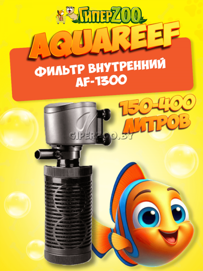 Внутренний фильтр AF-1300 1. Присоски для крепления, 2. Несущий корпус, 3. Воздушная трубка, 4. Фильтровальная чаша, 5. Фильтровочный материал (губка), 6.Стаканообразный картридж для фильтра, 7. Евро вилка Обслуживание Подготовка : Прикрепите присоски к задней стенке фильтра. Воздушную трубку подсоедините к регулятору подачи воздуха Установка и запуск в эксплуатацию: Прикрепите фильтр к внутренней стенке аквариума. Убедитесь что форсунка находится ниже уровня воды не более чем 1см, а воздушная трубка находится выше уровня воды. Вставьте штекер в розетку. Фильтр запущен. Уход и обслуживание Внимание!!! Перед тем, как осуществлять уход за фильтром обязательно отключите его от электросети. Очистка и замена фильтра: Любой фильтр со временем загрязняется. Частички грязи в аквариумной воде, а также недостаточная подача воздуха и слабый поток воды являются признаками того, что наполнитель фильтра следует очистить или заменить.