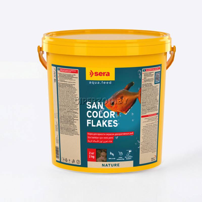 SERA Корм San Nature - натуральный корм в хлопьях для усиления окраса у всех видов рыб. Усиление яркости и насыщенности окраски рыб достигается исключительно за счет входящих в состав корма натуральных ингредиентов, таких как водоросль гематококкус богатой астаксантином, а также криля.