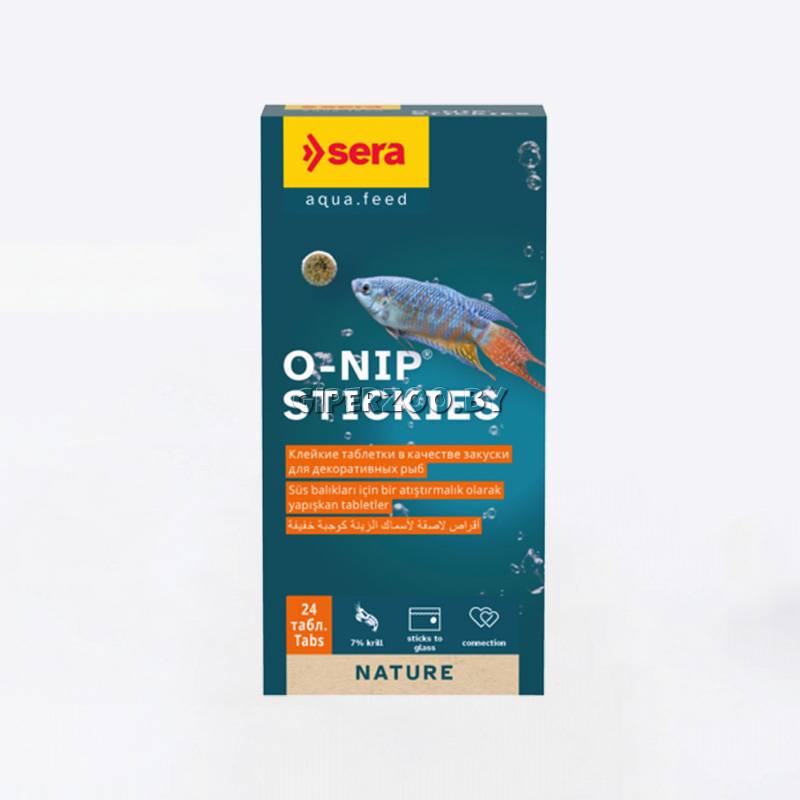 Sera O-Nip Nature – лакомство, не содержащее красителей и консервантов, в форме таблеток, произведенных путем бережной обработки сырья, прикрепляемых к стеклянной стенке аквариума легким прижатием пальца. Это позволяет наблюдать в процессе кормления даже за самыми пугливыми рыбками.