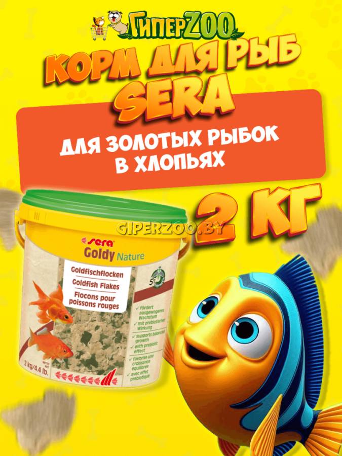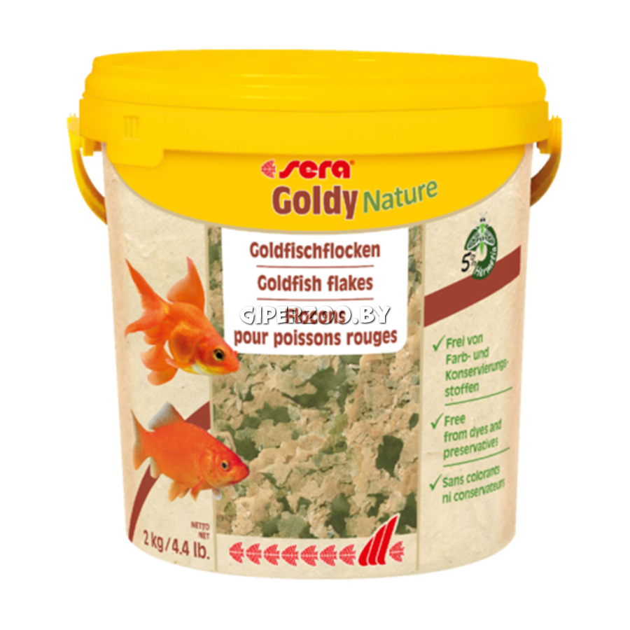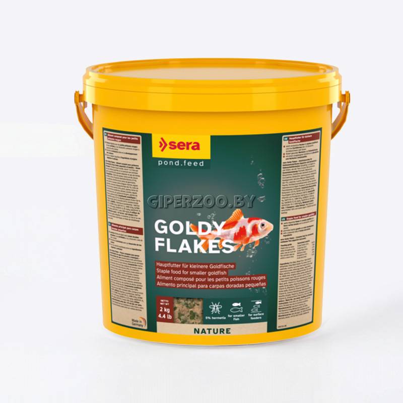 Sera голди – основной корм, состоящий из хлопьев, произведенных путем бережной обработки сырья; предназначен для кормления мелких золотых рыбок (включая привередливые и экзотические виды) и других разборчивых холодноводных видов рыб. Тщательно подобранные ингредиенты растительного и животного происхождения, такие как, богатый микроэлементами и каротиноидами гаммарус (4%), в итоге составляют легко усваиваемый, привлекательный для рыб корм, который способствует сбалансированному росту, устойчивости к заболеваниям, а также жизнестойкости этих прекрасных рыб. Благодаря тому, что плавающие хлопья корма долго не теряют свою форму в воде, они поедаются полностью и не загрязняют воду. Состав: рыбная мука, пшеничная мука, пивные дрожжи, казеинат кальция, гаммарус, мука их зеленых губчатых моллюсков, чеснок, крапива, люцерна, растительное сырье, морские водоросли, шпинат, паприка, петрушка, спирулина, морковь.