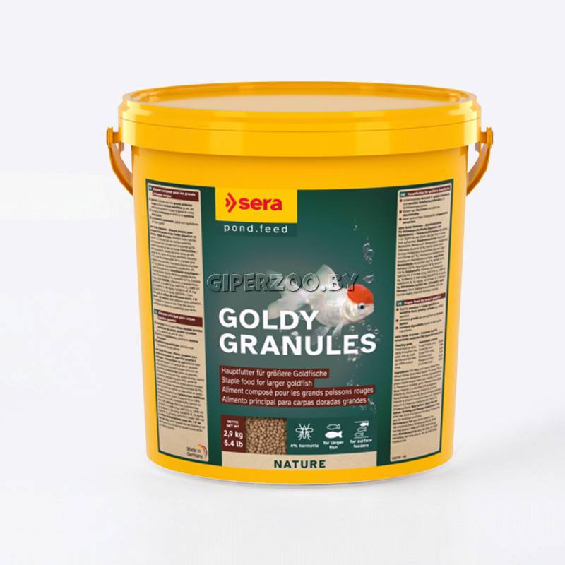SERA Корм гранулы для золотых рыбок "Goldy Gran", 2,9 кг - Гранулированный корм для крупных золотых рыбок и других холодноводных видов рыб. sera голди гран – основной корм, состоящий из гранул, произведенных путем бережной обработки сырья; предназначен для кормления более крупных золотых рыбок и других привередливых холодноводных видов рыб. Благодаря высококачественным ингредиентам, таким как, зародыши пшеницы (4%), Омега жирные кислоты и маннанолигосахариды, корм отлично усваивается и обеспечивает всеми необходимыми питательными веществами даже самые привередливые экзотические виды рыб. Рыбы, таким образом, растут сильными, без перекармливания; их устойчивость к заболеваниям повышается. Плавающий гранулированный корм долго не теряет свою форму в воде и не загрязняет ее.