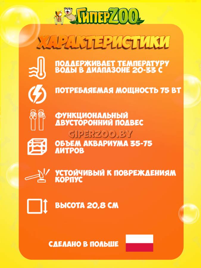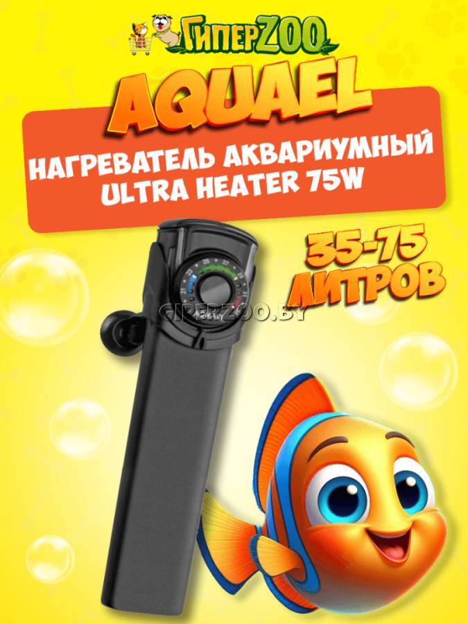 Aquael Ultra Heater 75W - пластиковый нагреватель с электронным термостатом мощностью 75 Вт для аквариумов 50-75л. Диапазон температур 20-33°C. В отличие от механического термостата предыдущих моделей, он предотвращает проблемы механических сбоев и, таким образом, предотвращает перегрев вашего аквариума. Благодаря двум присоскам его можно фиксировать повсюду и во всех направлениях. Температуру можно точно установить, используя большой эргономичный циферблат с расширенным температурным диапазоном от 17 до 36°C с точностью до ± 1°C. Обогревателем легко управлять с помощью системы One-Touch, в которой используется одна кнопка, окруженная кольцом светодиодов, показывающих текущую и заданную температуру. Ultra Heater оснащен системой безопасности, которая отключает нагрев, когда он находится вне воды, в случае испарения или поломки аквариума, что полностью исключает риск пожара. Ultra Heater также имеет встроенную систему для предотвращения перегрева воды в жаркую погоду.