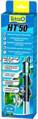Tetra HT 50 - Автоматический терморегулятор удобный регулятор установки температуры воды в диапазоне от 19 °C до 31°C с шагом в 0,5°C благодаря водонепроницаемому корпусу и крышке нагреватель может быть полностью погружен в воду контрольный световой индикатор очень толстое двухмиллиметровое сверхпрочное и теплостойкое стекло Bоrosilikat двойной керамический нагревательный элемент для равномерного распределения тепла надежное крепление с помощью двух присосок длинный 1,6-метровый кабель для удобства установки в аквариуме легко считываемые показания нагревателя сертификаты контроля качества TÜV / GS, сертификат качества CE 2 года гарантии Мощность: 50 Вт. Для аквариума: 25-60 литров.