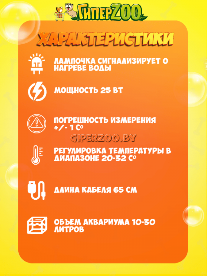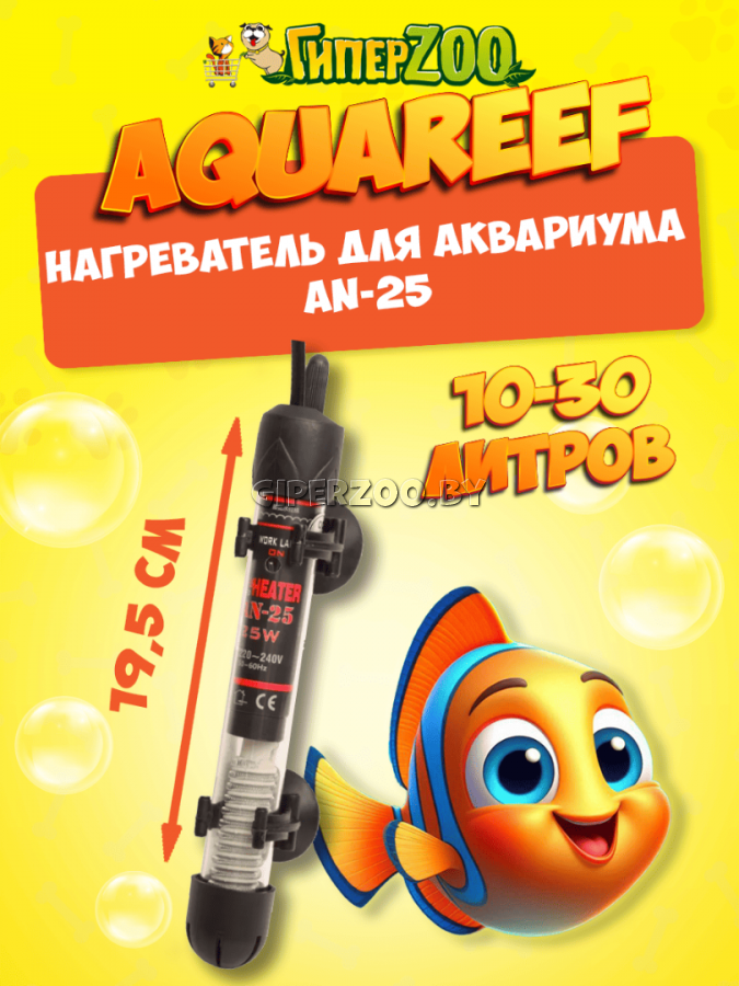 Обогреватель воды предназначен для эксплуатации только в замкнутых помещениях и исключительно в аквариумах. Обогреватель воды водонепроницаем, его можно полностью погрузить в воду и установить в аквариуме в любом положении. Пластмассовая головка с вращающимся регулятором может находиться над поверхностью воды только в горизонтальной позиции. Не следует погружать подогреватель в песок и гравий. Уровень воды должен быть выше, чем минимальный уровень погружения МИНИМУМ, указанный на стеклянном корпусе устройства. Следует помнить, что в результате испарения уровень воды снижается. Не следует вставлять обогреватель в грунт. Обогреватель следует прикрепить к стеклу аквариума при помощи присосок, которые следует установить на обогреватель, непосредственно под головкой. Обогреватель должен быть установлен в месте, в котором обеспечена постоянная и равномерная циркуляция воды. Биметаллический переключатель в обогревателе адаптируется к температуре