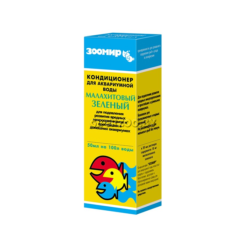 Кондиционер «Малахитовый зеленый» - раствор синтетического красителя малахитового зеленого. Предназначен для создания и поддержания безопасной, здоровой среды в аквариуме, препятствующей развитию находящихся в аквариумной воде вредных микроорганизмов и простейших. Кондиционировать воду с помощью кондиционера «Малахитовый зеленый» можно только в аквариумах, в которых содержатся взрослые рыбы следующих групп: живородящие и икромечущие карпозубые, лабиринтовые, африканские и американские харациновые, цихловые, карповые (в том числе барбусы, расборы и золотые рыбки декоративных форм). Для аквариума с другими рыбами, особенно не имеющими чешуи, а также для мальков и подростков необходимо выбрать другой кондиционер или снизить концентрацию данного кондиционера по крайней мере в 2 раза.
